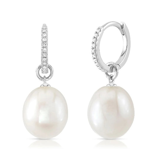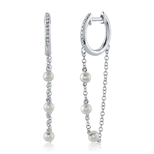 14K Gold 0.05 CT Diamond Pearl Huggie Chain Earrings