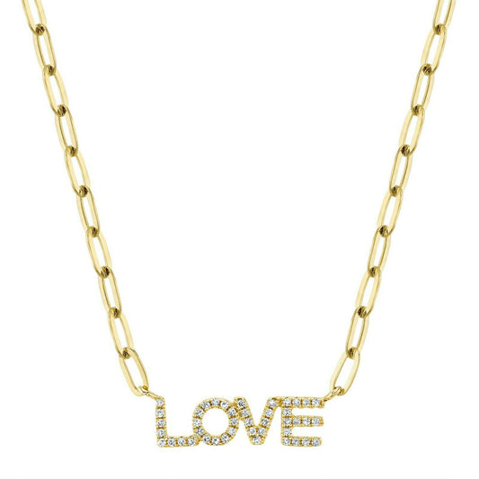 14K Gold 0.12 CT Diamond LOVE Letter Initials Necklace Paper Clip Chain