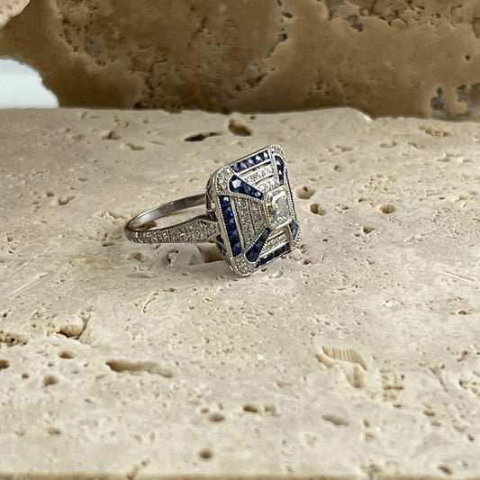 Art Deco Inspired Asscher Cut Diamond Sapphire Platinum Ring