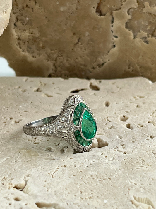 Art Deco Inspired Pear Cut Emerald Platinum Diamond Ring