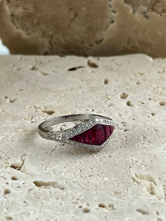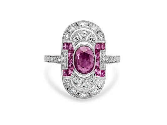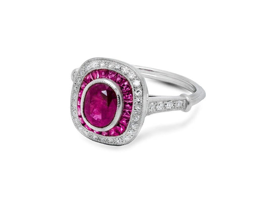 Art Deco Inspired Ruby Oval French Cut Diamond Platinum Ring