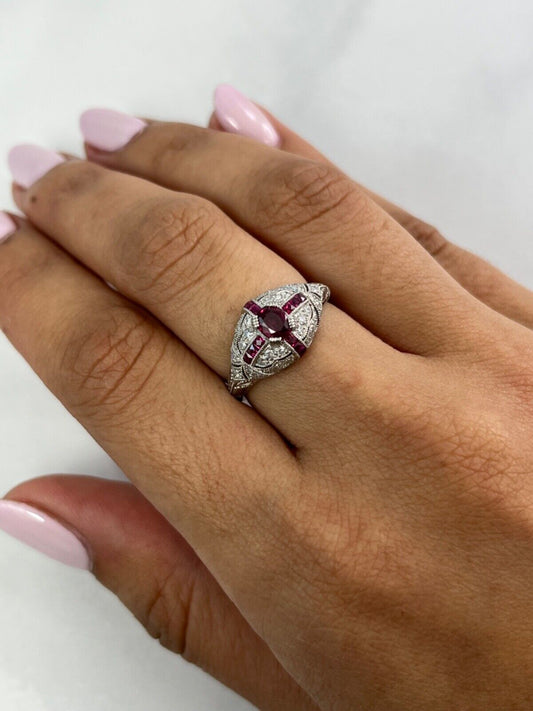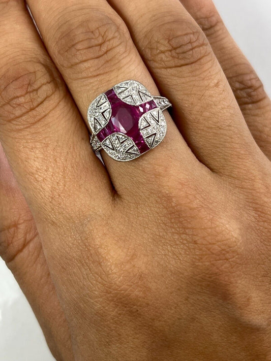 Art Deco Ruby Diamond Platinum Oval Ring Antique Inspired Natural