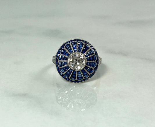 Art Deco Old Mine European Diamond Sapphire Platinum Ring Natural
