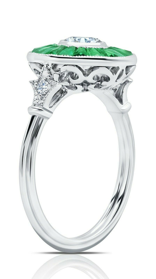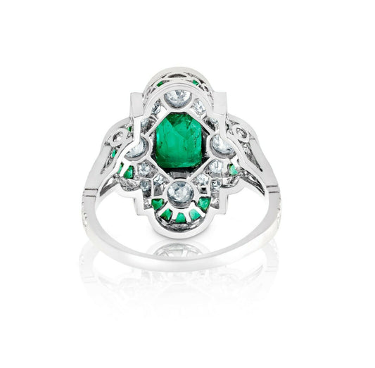 Art Deco Diamond Emerald Platinum Ring Handmade Certified Natural