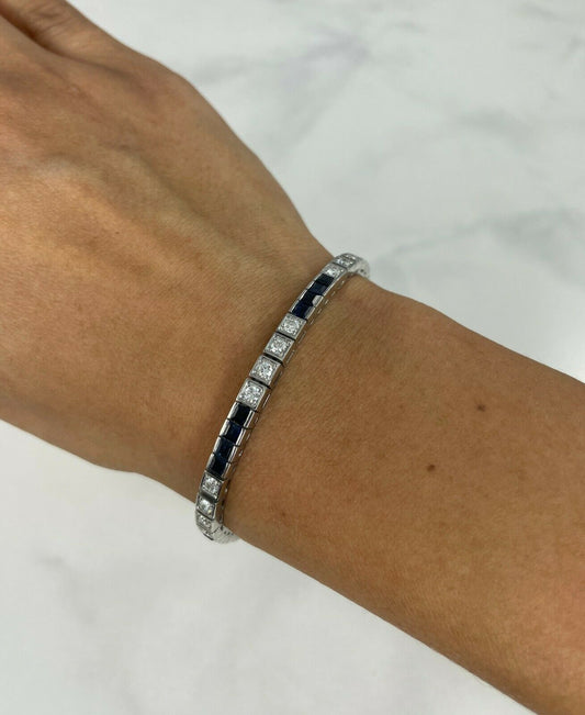 18K White Gold 5.60 TCW Blue Sapphire Diamond Tennis Bracelet Princess Round