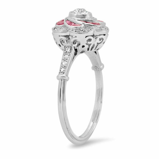 Art Deco Ruby Diamond Platinum Flower Ring Natural Handmade