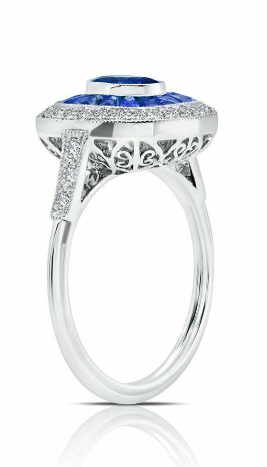 Art Deco Oval Blue Sapphire Diamond Platinum Ring French Cut Baguette Natural