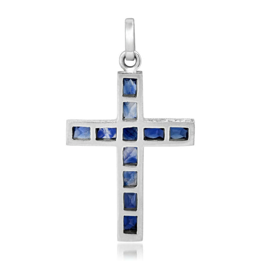 Art Deco Blue Sapphire Cross Platinum Pendant Necklace Handmade Engraved