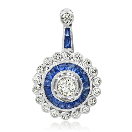 French Cut Sapphire Diamond Platinum Pendant Necklace Art Deco Chain Included