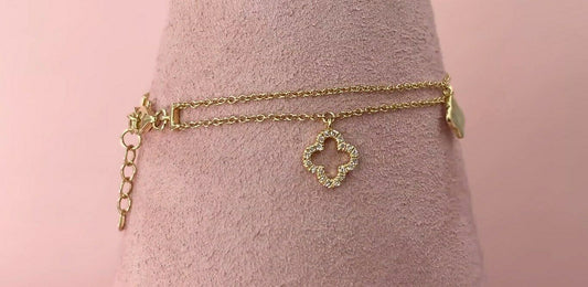 14K Gold 0.19 CT Diamond Clover Charm Bracelet Round Cut Natural Womens