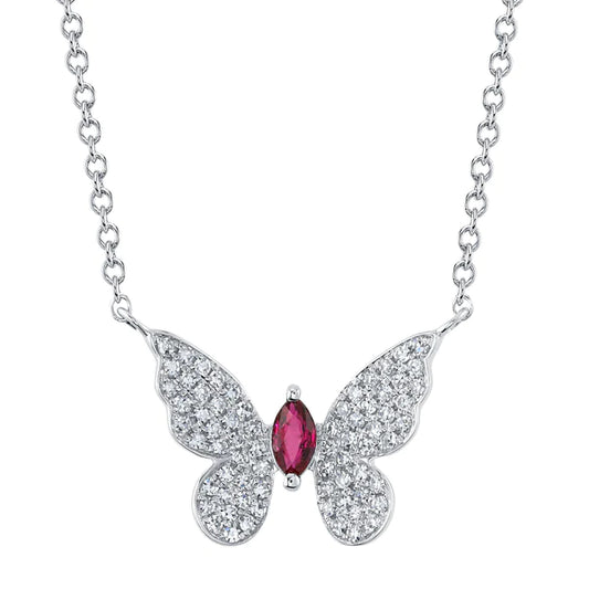 14K Gold 0.25 CT Diamond & 0.09 CT Ruby Butterfly Necklace