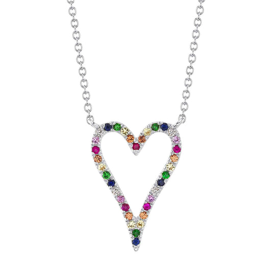 Multi Color Gemstone Diamond Rainbow Heart Necklace 14K Yellow Gold Pendant