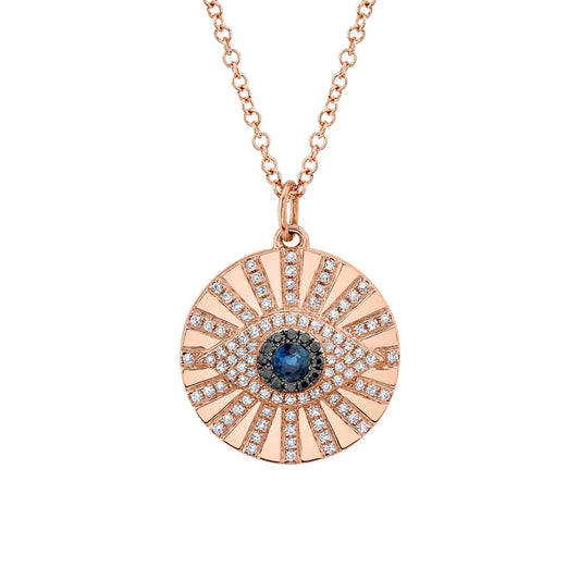 14K Yellow Gold Eye Necklace Black White Diamond Blue Sapphire Circle Disc Evil