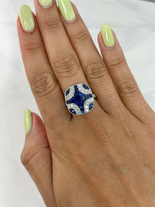 Art Deco Oval Sapphire Diamond Platinum Ring 3.89 TCW Natural