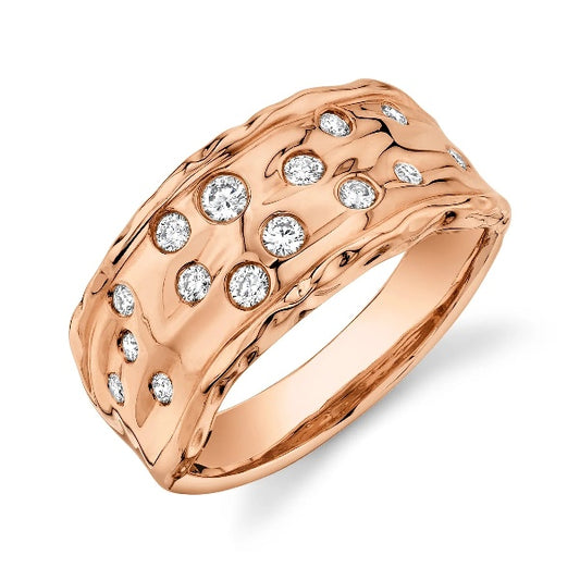 14K Gold 0.30 CT Scattered Floating Diamond Ring Unique Wavy Hammered Round Bezel
