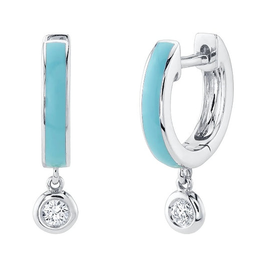 14K Gold 0.08 CT Diamond Turquoise Enamel Huggie Earrings Drop Round Bezel Set