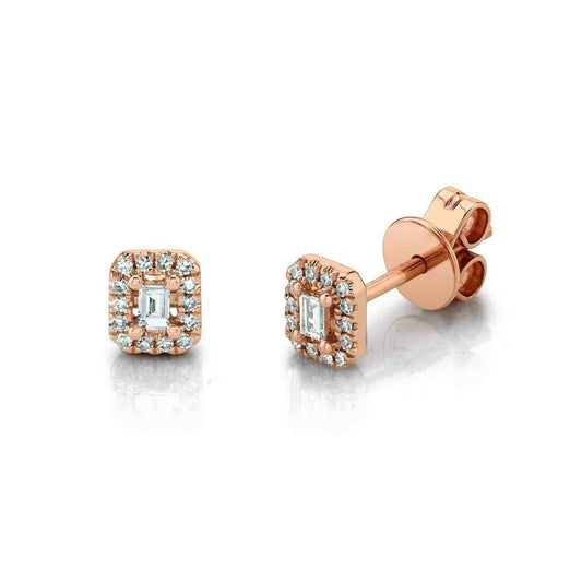 14K Gold 0.12 CT Baguette Cut Diamond Stud Earrings Halo Square