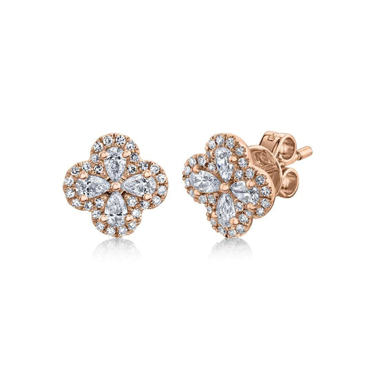 14K Gold 0.60 TCW Diamond Clover Flower Stud Earrings Pear Cut Natural