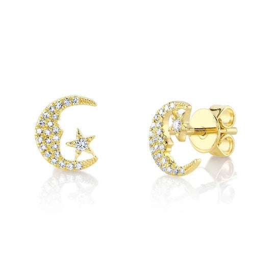 14K Gold 0.12 CT Diamond Moon And Star Stud Earrings Round Cut Natural