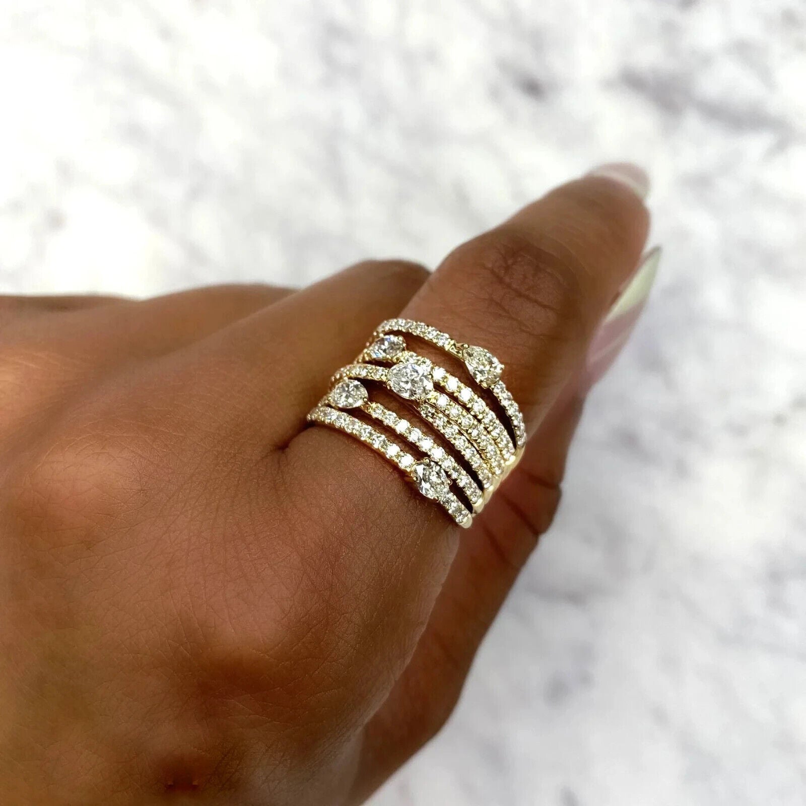 14K Gold Pear Oval Diamond Ring Cocktail Crossover Layered Bands Natural